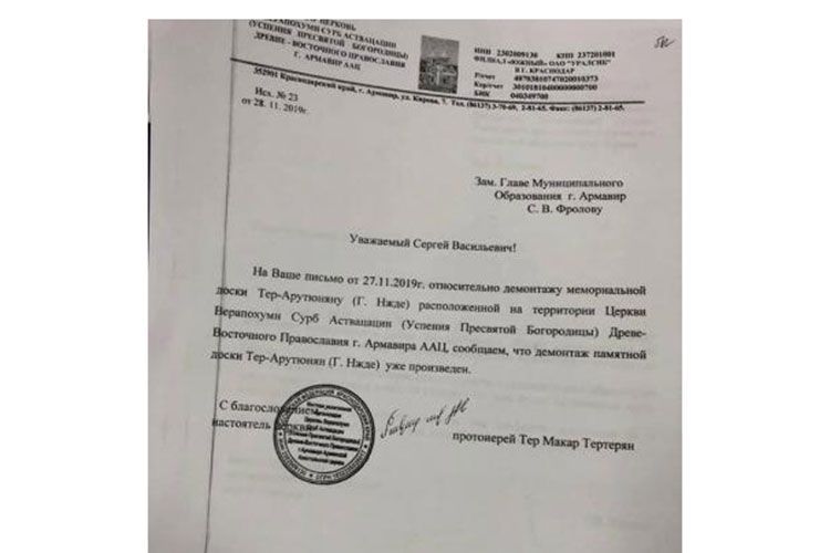 Rusiyanın Armavir şəhərində nasistlərə xidmət etmiş Qaregin Njdenin xatirə lövhəsi sökülüb.