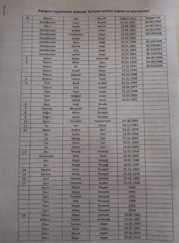 Məlum olub ki, siyahıda adları qeyd olunmuş 60 suriyalı erməni (cəmi 19 ailə) işğal olunmuş ərazilərdə Ermənistan tərəfindən aparılmış qanunsuz məskunlaşma prosesində Zəngilan rayonu ərazisinə köçürülüb.