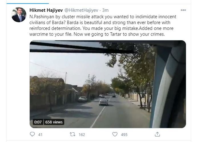 "N.Paşinyan, çoxsaylı raket hücumları ilə Bərdədəki günahsız mülki insanları qorxutmaq istədiniz? Bərdə, qətiyyətlə əvvəlkindən daha gözəl və güclüdür. Böyük səhvinizi etdiniz, dosyanıza daha bir müharibə cinayəti əlavə etdiniz. İndi cinayətlərinizi göstərmək üçün Tərtərə gedirik".