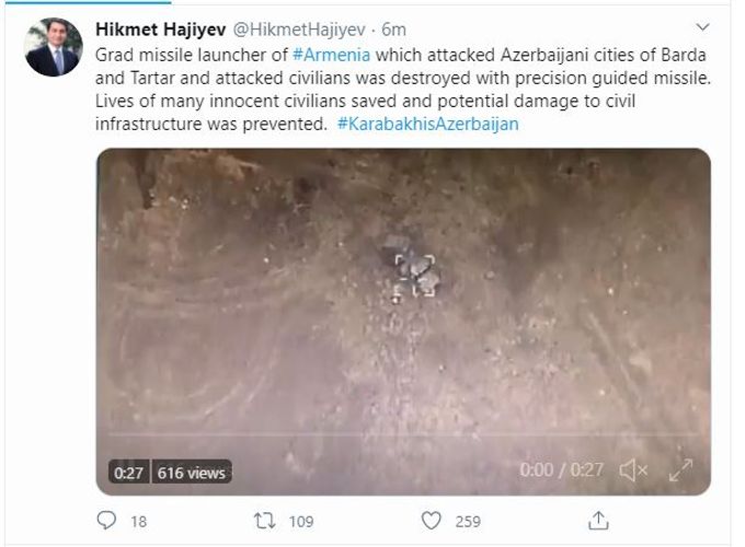 "Ermənistan Silahlı Qüvvələrinin Azərbaycanın mülki əhali yaşayan Bərdə və Tərtər şəhərlərinə atdığı raketlər dəqiqliklə məhv edilib. Bununla da ərazidə yaşayan çoxlu sayda günahsız mülki əhalinin həyatı və bir sıra obyektlər potensial təhlükədən xilas edildi".