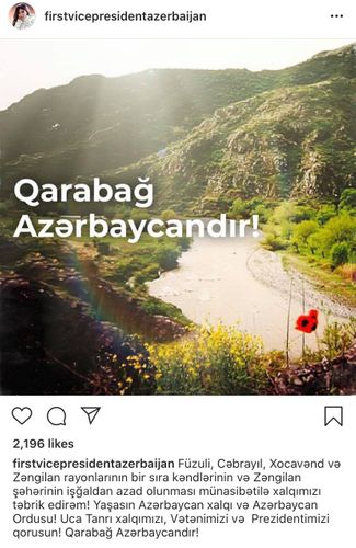 "Füzuli, Cəbrayıl, Xocavənd və Zəngilan rayonlarının bir sıra kəndlərinin və Zəngilan şəhərinin işğaldan azad olunması münasibətilə xalqımızı təbrik edirəm! Yaşasın Azərbaycan xalqı və Azərbaycan Ordusu! Uca Tanrı xalqımızı, Vətənimizi və Prezidentimizi qorusun! Qarabağ Azərbaycandır!".