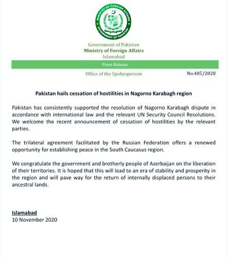 “Pakistan daim Dağlıq Qarabağ münaqişəsinin beynəlxalq hüquq və BMT Təhlükəsizlik Şurasının müvafiq qətnamələrinə uyğun olaraq nizamlanmasını dəstəkləyib.Tərəflərin hərbi əməliyyatları dayandırmasını elan etmələrini alqışlayırıq. Rusiya Federasiyasının vasitəçiliyi ilə əldə edilmiş üçtərəfli razılaşma Cənubi Qafqaz regionunda sülhün bərqərar olması üçün yeni bir fürsət yaradır.