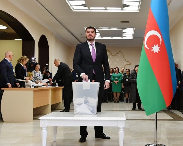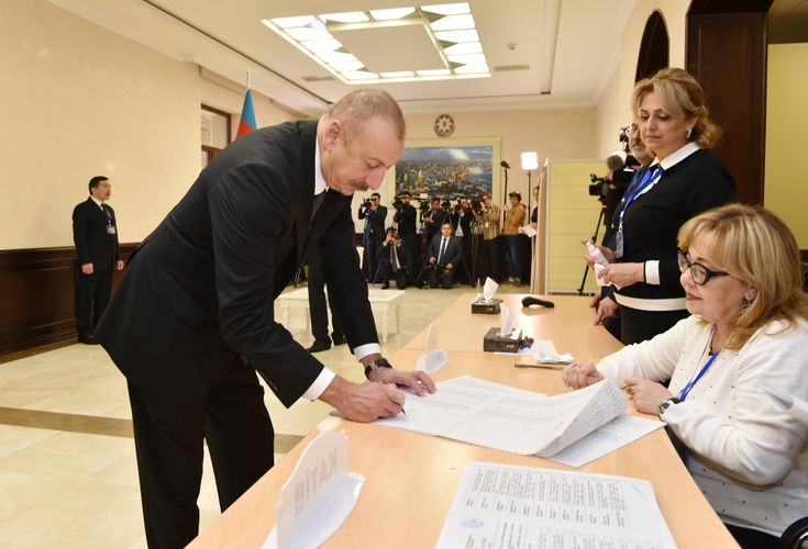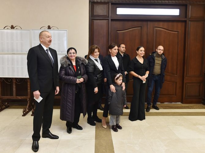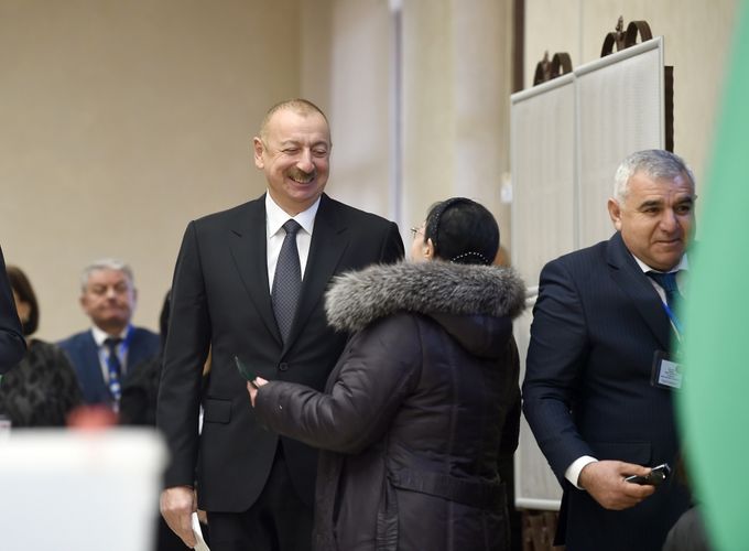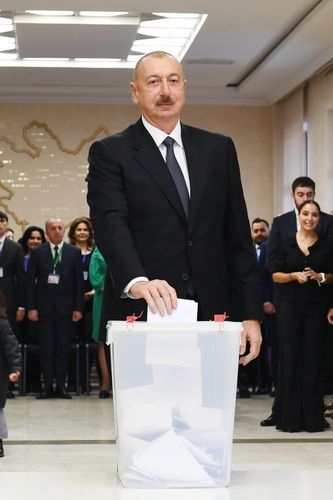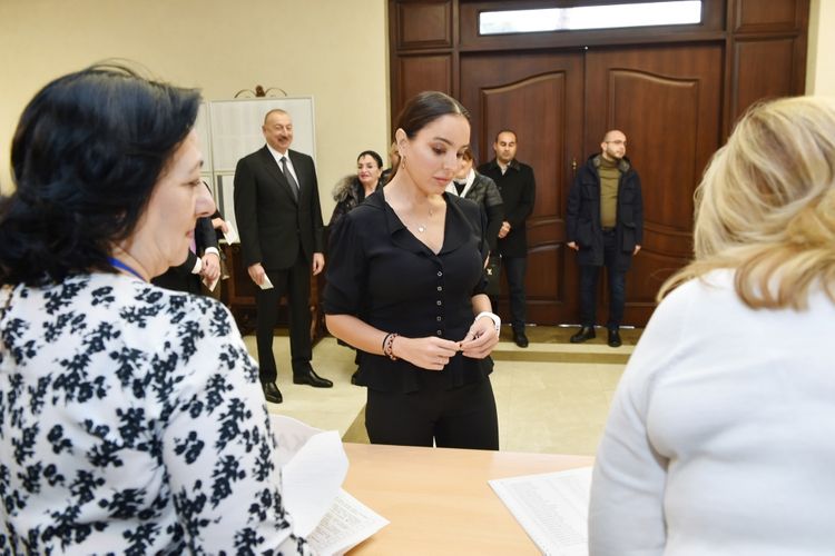 Azərbaycan Respublikasının Prezidenti İlham Əliyev, birinci xanım Mehriban Əliyeva və ailə üzvləri səs vermək üçün bu seçki məntəqəsinə gəldilər.