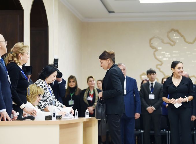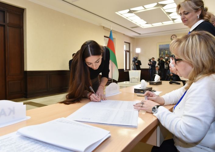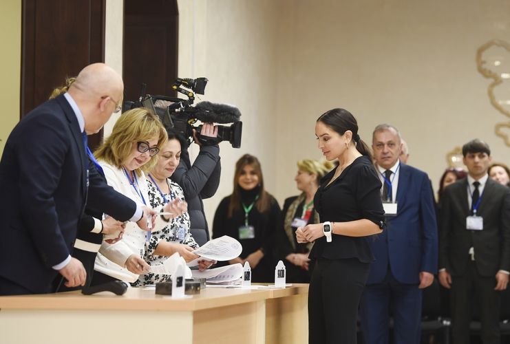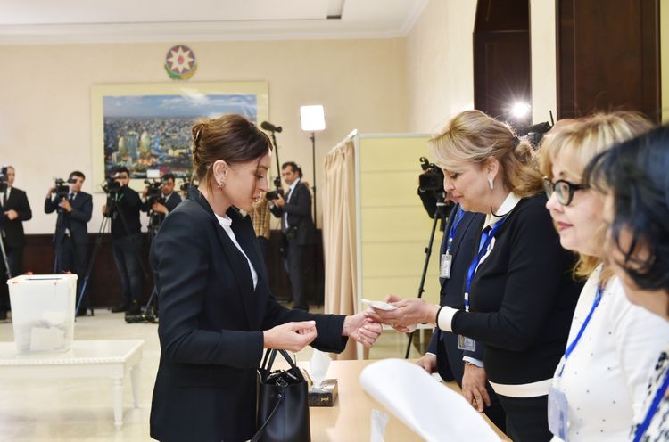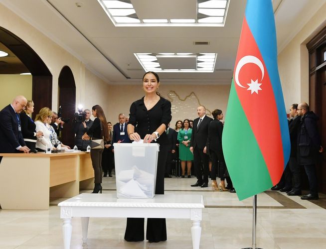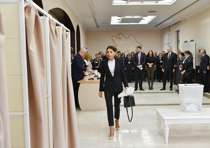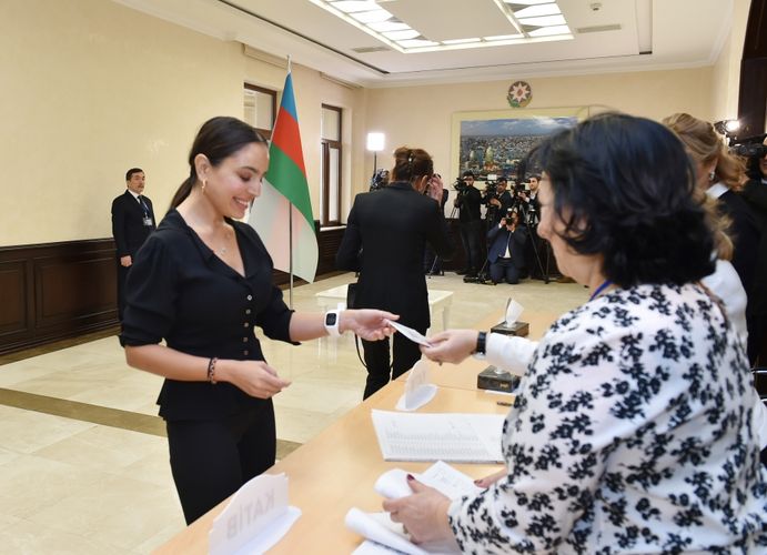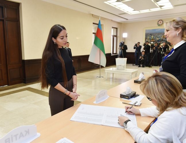 Sonra birinci xanım Mehriban Əliyeva və ailə üzvləri səs verdilər.