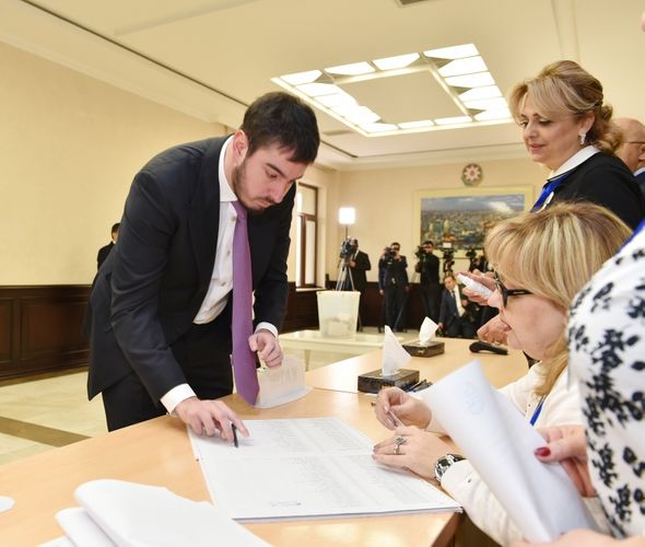Prezident İlham Əliyev səsvermə otağına daxil olub seçki bülletenini alaraq kabinəyə keçdi və sonra bülleteni qutuya saldı.