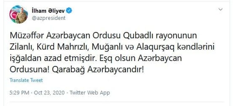 Qeyd olunub ki, Müzəffər Azərbaycan Ordusu Xocavənd rayonunun Dolanar, Bünyadlı kəndlərini,