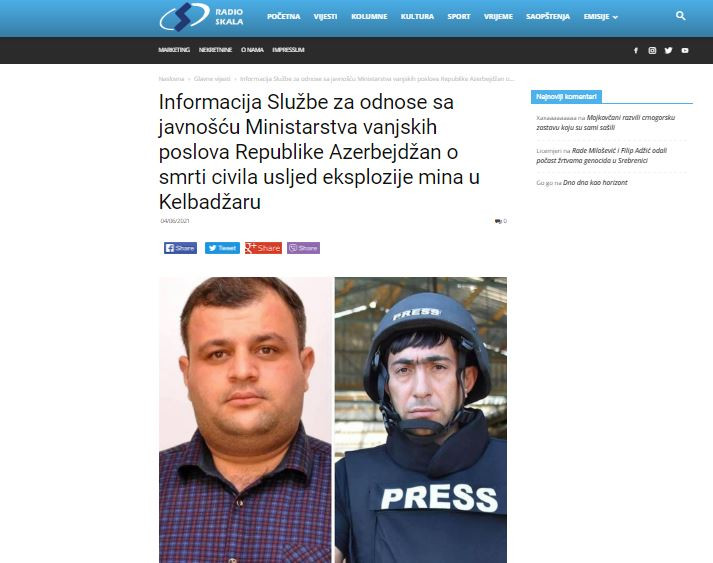 Azərbaycan–Monteneqro İqtisadi ve Mədəniyyət Mərkəzinin təşəbbüsü ilə ölkənin https://skalaradio.com və https://www.aktuelno.me xəbər saytlarında Kəlbəcərdə mina partlaması nəticəsində Azərbaycan jurnalistlərinin və mülki şəxslərin həlak olması barədə ətraflı məlumat yayılıb.