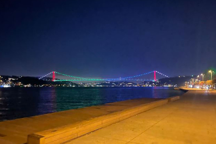 Türkiyənin İstanbul şəhərində məşhur Fatih Sultan Mehmet körpüsü Azərbaycan bayrağının rəngləri ilə işıqlandırılıb.