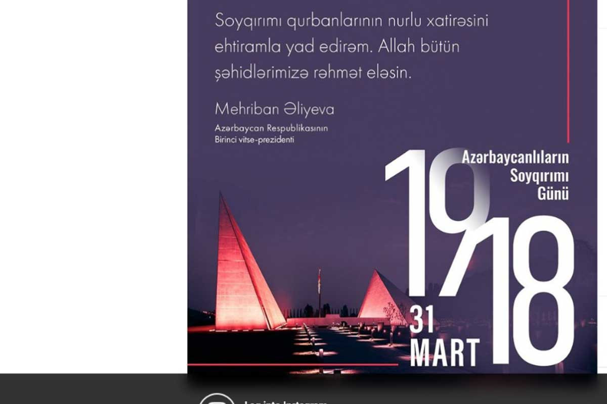 Birinci vitse-prezident Mehriban Əliyeva 31 Mart - Azərbaycanlıların Soyqırımı Günü ilə bağlı paylaşım edib.