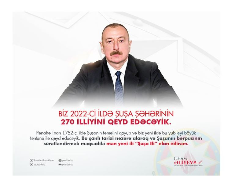 "Biz 2022-ci ildə Şuşa şəhərinin 270 illiyini qeyd edəcəyik. Pənahəli xan 1752-ci ildə Şuşanın təməlini qoyub və biz yeni ildə bu yubileyi böyük təntənə ilə qeyd edəcəyik. Bu şanlı tarixi nəzərə alaraq və Şuşanın bərpasının sürətləndirmək məqsədilə mən yeni ili “Şuşa İli” elan edirəm", - deyə dövlət başçısı bildirib.