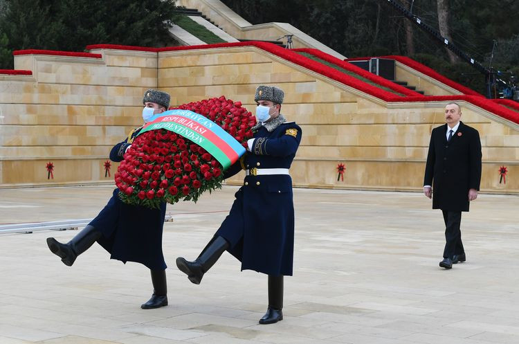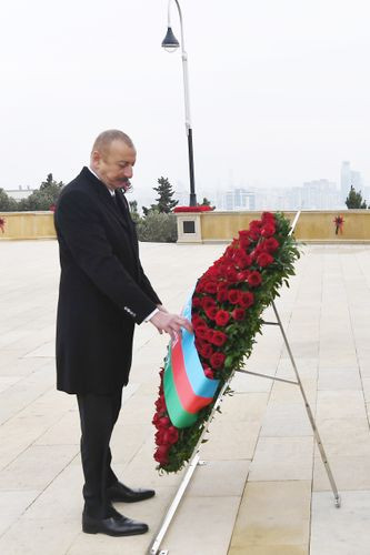 Prezident İlham Əliyev “Əbədi məşəl” abidəsi önünə əklil qoyub. Azərbaycan Respublikasının dövlət himni səsləndirilib.