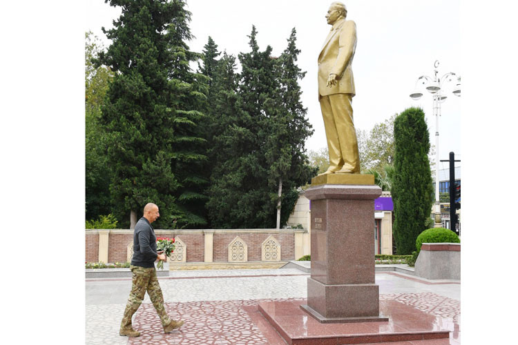 APA-nın məlumatına görə, dövlət başçısı Tərtər şəhərinin mərkəzində ulu öndər Heydər Əliyevin abidəsini ziyarət edərək önünə gül dəstəsi qoyub.