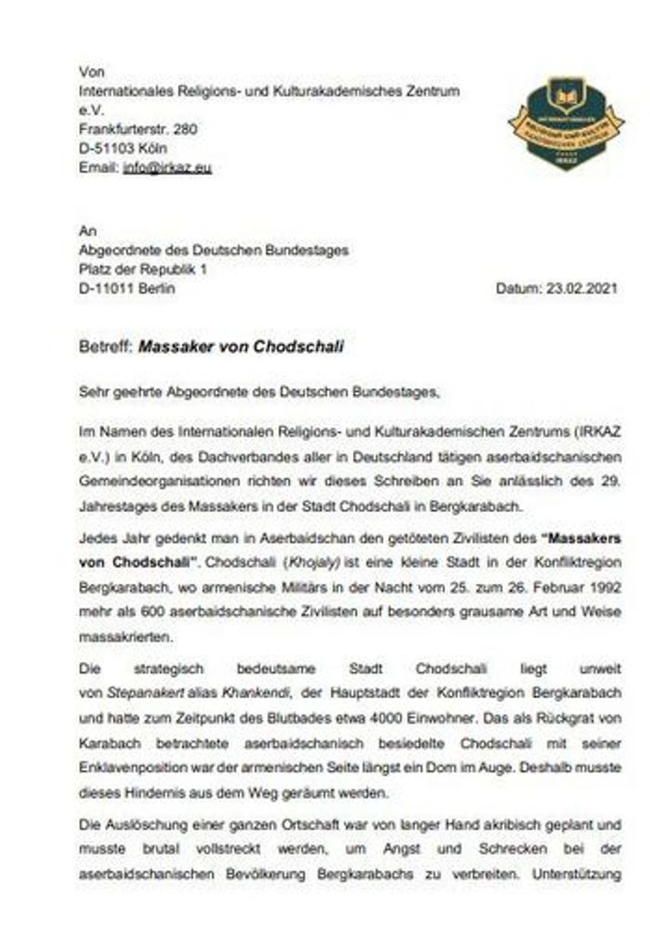 Almaniyanın Münhen şəhərində fəaliyyət göstərən Azərbaycan Mədəniyyət Mərkəzi və "İRKAZ" – Beynəlxalq Din və Mədəniyyət Elmi Mərkəzi Xocalı soyqırımına hüquqi-siyasi qiymət verilməsi çağırışı ilə Almaniya bundestaqına müraciət edib.