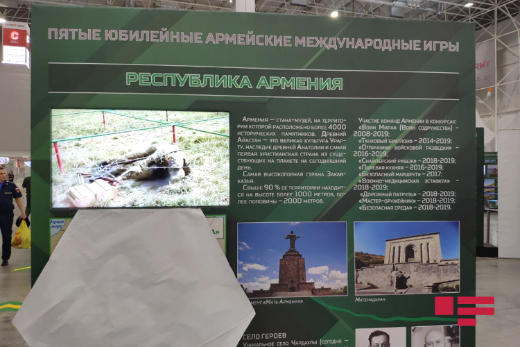 APA-nın Moskva müxbirinin verdiyi məlumata görə, Moskva vilayətinin Kubinka rayonunda yerləşən “Patriot-Ekspo” Konqres-Sərgi Mərkəzində nümayiş olunan stenddə Ermənistan Azərbaycanın Dağlıq Qarabağ və ətraf rayonlarını öz ərazisi kimi təqdim edib.