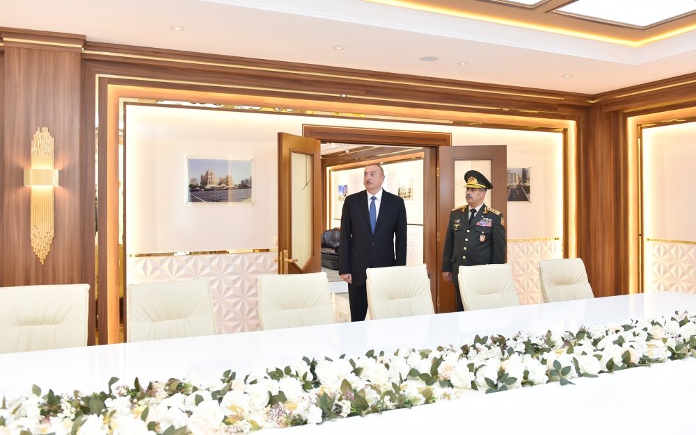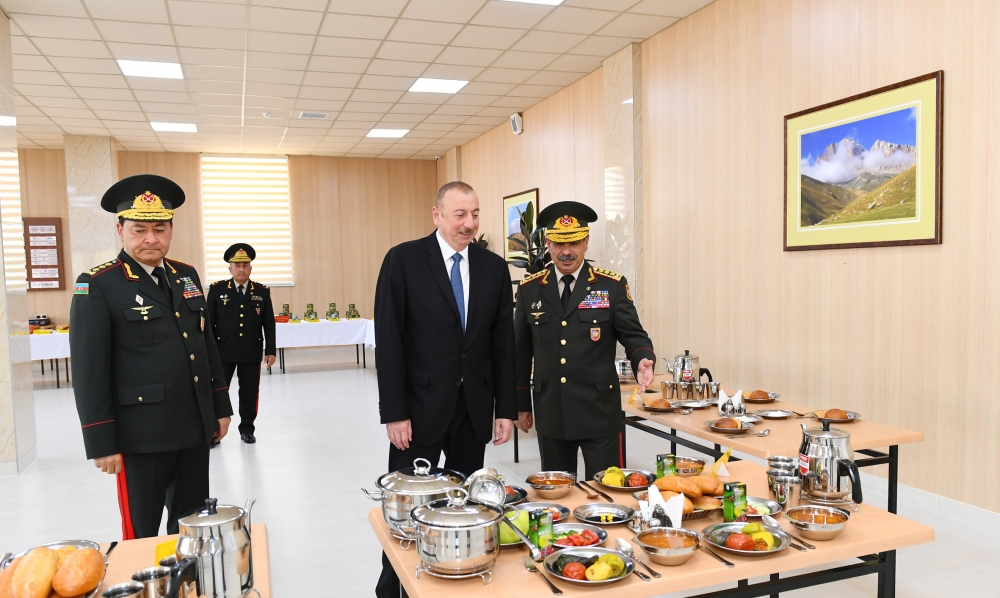 Daha sonra dövlət başçısı kursant yeməkxanasında yaradılan şəraitlə maraqlandı. İkimərtəbəli yeməkxana binası da əsaslı təmir olunub. Bütün avadanlıqla təchiz edilmiş binada eyni vaxtda 600 kursant nahar edə bilər. Burada yemək zalı, mətbəx və təsərrüfat otaqları, ərzaq və soyuducu anbarlar var. Dövlətimizin başçısının qayğısı sayəsində bu gün Azərbaycan Ordusunda xidmət edən hərbi qulluqçuların qidalanması məsələsinə də xüsusi diqqət yetirilir.