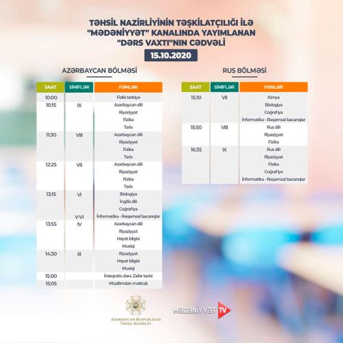 Lent.az məlumat verir ki, Təhsil Nazirliyi dərs cədvəlinə diqqət yetirməyi, mövzuları “Dərs vaxtı”nda öyrənməyi tövsiyə edir.