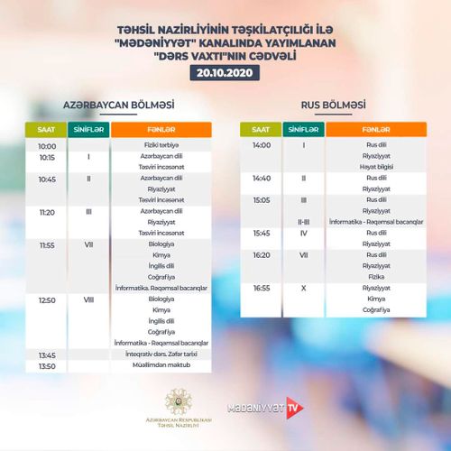 Lent.az məlumat verir ki, Təhsil Nazirliyi dərs cədvəlinə diqqət yetirməyi, mövzuları “Dərs vaxtı”nda öyrənməyi tövsiyə edir.
