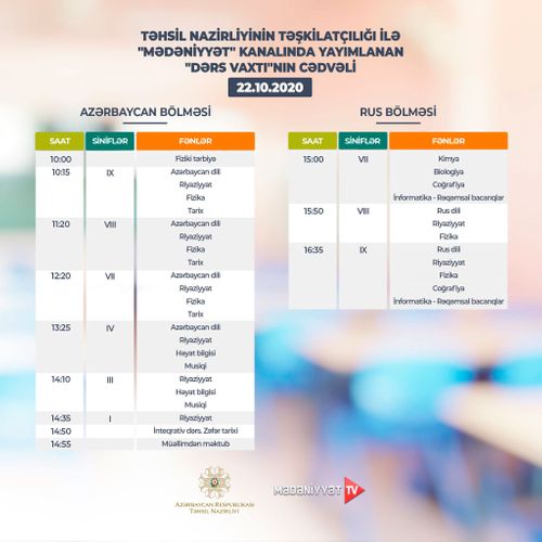 Lent.az məlumat verir ki, Təhsil Nazirliyi dərs cədvəlinə diqqət yetirməyi, mövzuları “Dərs vaxtı”nda öyrənməyi tövsiyə edir.