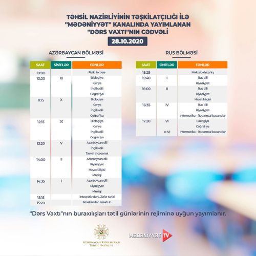Lent.az məlumat verir ki, Təhsil Nazirliyi dərs cədvəlinə diqqət yetirməyi, mövzuları “Dərs vaxtı”nda öyrənməyi tövsiyə edir.