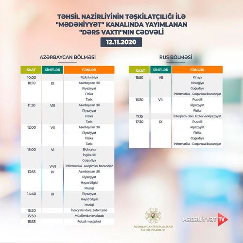 Lent.az məlumat verir ki, Təhsil Nazirliyi dərs cədvəlinə diqqət yetirməyi, mövzuları “Dərs vaxtı”nda öyrənməyi tövsiyə edir.