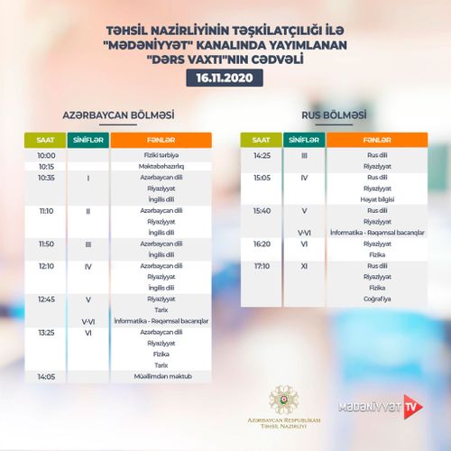 Lent.az məlumat verir ki, Təhsil Nazirliyi dərs cədvəlinə diqqət yetirməyi, mövzuları “Dərs vaxtı”nda öyrənməyi tövsiyə edir.