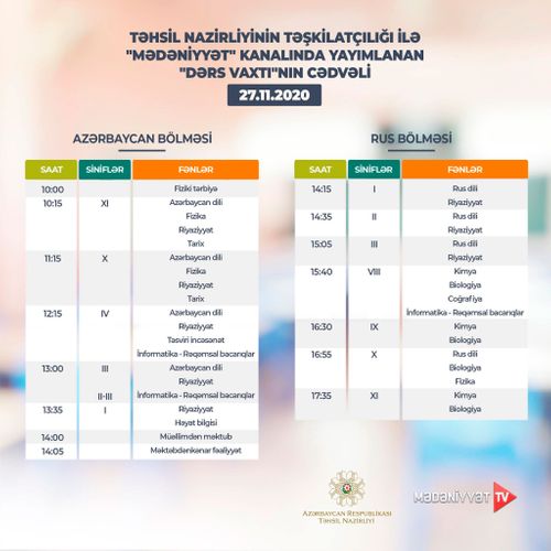 Lent.az məlumat verir ki, Təhsil Nazirliyi dərs cədvəlinə diqqət yetirməyi, mövzuları “Dərs vaxtı”nda öyrənməyi tövsiyə edir.