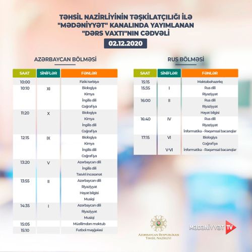 Lent.az məlumat verir ki, Təhsil Nazirliyi dərs cədvəlinə diqqət yetirməyi, mövzuları “Dərs vaxtı”nda öyrənməyi tövsiyə edir.