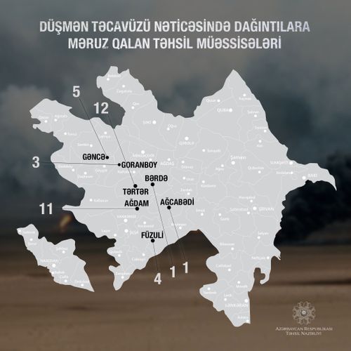 Nazirlik həmçinin düşmən təcavüzü nəticəsində dağıntılara məruz qalan təhsil müəssisələrinin siyahısınıda açıqlayıb. Bildirilib ki, onların sayı 37-dir (Tərtər – 12 məktəb, Ağdam – 11 məktəb, Gəncə - 5 məktəb, Füzuli – 4 məktəb, Goranboy – 3 məktəb, Bərdə - 1 məktəb, Ağcabədi – 1 məktəb).