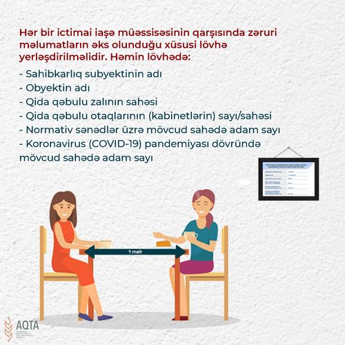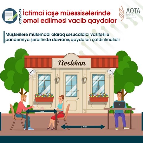 Nazirlər Kabinetinin müvafiq qərarına əsasən, qida qəbulu zallarında oturacaqların ara məsafəsi eyni masa arxasında 1 metrdən, masalararası məsafə isə 2 metrdən az olmamalıdır. Koronavirus (COVID-19) pandemiyası dövründə ictimai iaşə müəssisələrində müştəri qəbulu qüvvədə olan norma və qaydalardan 2 dəfə az olmalı və müvafiq olaraq, adambaşına müəyyən edilən sahə ikiqat artırılmalıdır.