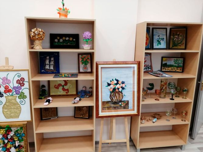 Məhəbbət Vəliyeva əvvəlcə şagirdlərin əl işlərindən təşkil olunmuş sərgi ilə tanış olub.