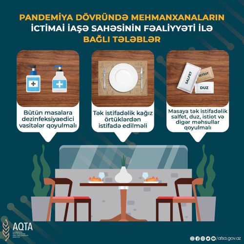 Bu barədə Lent.az-a Azərbaycan Qida Təhlükəsizliyi Agentliyindən məlumat verilib. Bildirilib ki, kafe-restoranlarda, mehmanxanaların və təhsil müəssisələrinin nəzdindəki ictimai iaşə sahəsində əhalinin sağlamlığının qorunması və təhlükəsizliyinin təmin edilməsi məqsədilə sanitariya-gigiyena və karantin qaydalarının tələblərinə ciddi əməl edilməlidir.