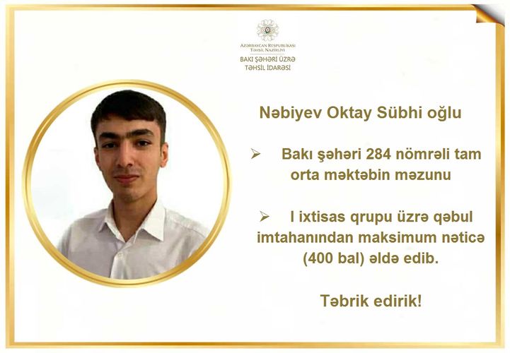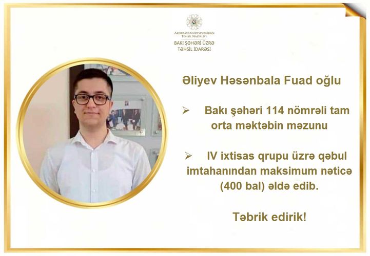 BŞTİ-dən Lent.az-a verilən məlumata görə, 20-21 avqust tarixlərində keçirilmiş qəbul imtahanlarının (XI sinif üzrə) nəticələrinə əsasən, BŞTİ-nin tabeliyindəki 114 nömrəli tam orta məktəbin məzunu Əliyev Həsənbala Fuad oğlu, 166 nömrəli məktəb-liseyin məzunu Bürcəliyev Səbuhi Məlikəjdər oğlu, 229 nömrəli tam orta məktəbin məzunu Ağakişiyev Məhəmməd Rəsul oğlu, 284 nömrəli tam orta məktəbin məzunu Nəbiyev Oktay Sübhi oğlu və 311 nömrəli tam orta məktəbin məzunu Hüseynov Səbuhi Ramiq oğlu 400 bal toplayıblar. Qeyd edək ki, bu mərhələdə toplanıla biləcək maksimal bal 400 baldır.