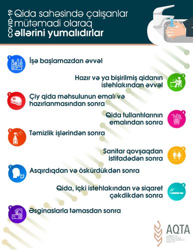 • Bu cür məkanlarda mütəmadi dezinfeksiya işləri aparılmalı, hər bir masada dezinfeksiyaedici məhlulların yerləşdirilməsi təmin olunmalıdır. Qida qəbulu zallarında, otaqlarda və açıq məkanlarda sərinkeşlərdən (ventilyatorlardan) istifadə olunmamalı, təmizlik-dezinfeksiya işləri iş saatı ərzində əsasən işlək sahələrdə (giriş-çıxış, kassa və s.), iş saatından sonra isə bütün sahələrdə həyata keçirilməlidir.