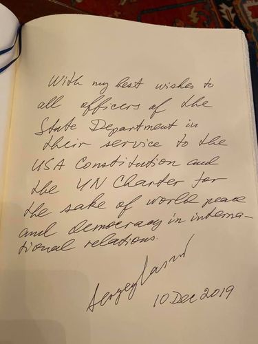 Rusiyanın Xarici İşlər Nazirliyinin sözçüsü Mariya Zaxarova öz Facebook səhifəsində maraqlı paylaşım edib. Lent.az-ın məlumatına görə, xanım Zaxarova əvvəlcə Lavrovun dekabrın 10-da ABŞ-a rəsmi səfəri çərçivəsində bu ölkənin dövlət katibi Mayk Pompeo ilə görüşünə toxunub. Daha sonra isə nazirin Dövlət Departamentində fəxri qonaqlar üçün nəzərdə tutulmuş kitabda etdiyi qeyd apardığı anın görüntüsünü paylaşıb. Həmin qeydlərin edildiyi otaqda ən çox nəzərə çarpan isə döşəmədəki xalçalar olub.