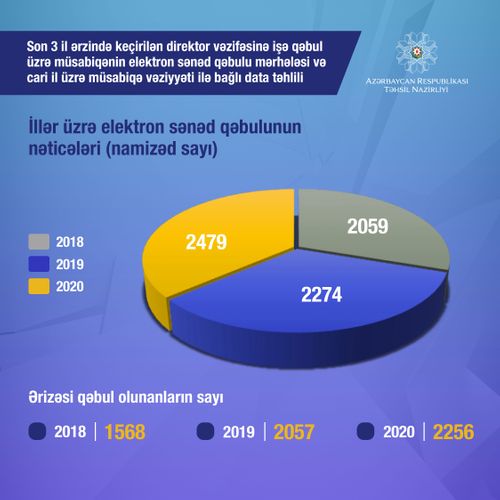 Ümumi təhsil müəssisələrinə direktor vəzifəsinə işə qəbul üzrə müsabiqənin elektron sənəd qəbulu mərhələsində 2018-ci il üzrə 2 059 namizəd, 2019-cu il üzrə 2 274 namizəd, 2020-ci il üzrə 2 479 namizəd iştirakını təsdiq edib.