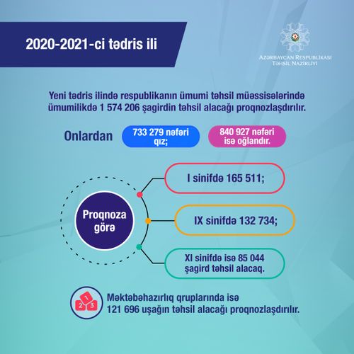 2020-2021-ci tədris ilinin əvvəlinə olan proqnoz göstəricilərinə əsasən, yeni tədris ilində respublikanın ümumi təhsil müəssisələrində ümumilikdə 1 574 206 şagirdin təhsil alacağı gözlənilir.
