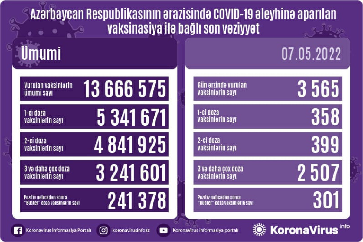 Vurulan vaksinlərin ümumi sayı 13 666 575, birinci mərhələ üzrə vaksinasiya olunanların ümumi sayı 5 341 671, ikinci mərhələ üzrə vaksinasiya olunanların sayı 4 841 925, üç və daha çox doza üzrə vaksinasiya olunanların sayı 3 241 601, pozitiv nəticədən sonra buster doza üzrə vaksinasiya olunanların sayı isə 241 378 nəfər təşkil edir.