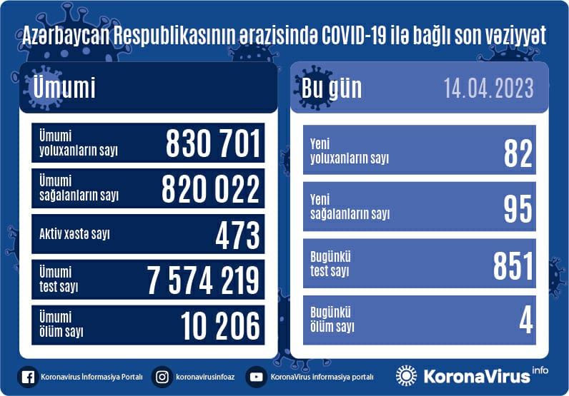 Azərbaycanda indiyədək ümumilikdə 830 701 nəfərin koronavirus infeksiyasına yoluxması faktı müəyyən edilib. Onlardan 820 022 nəfər müalicə olunaraq sağalıb, 10 026 nəfər vəfat edib, aktiv xəstə sayı 473 nəfərdir.