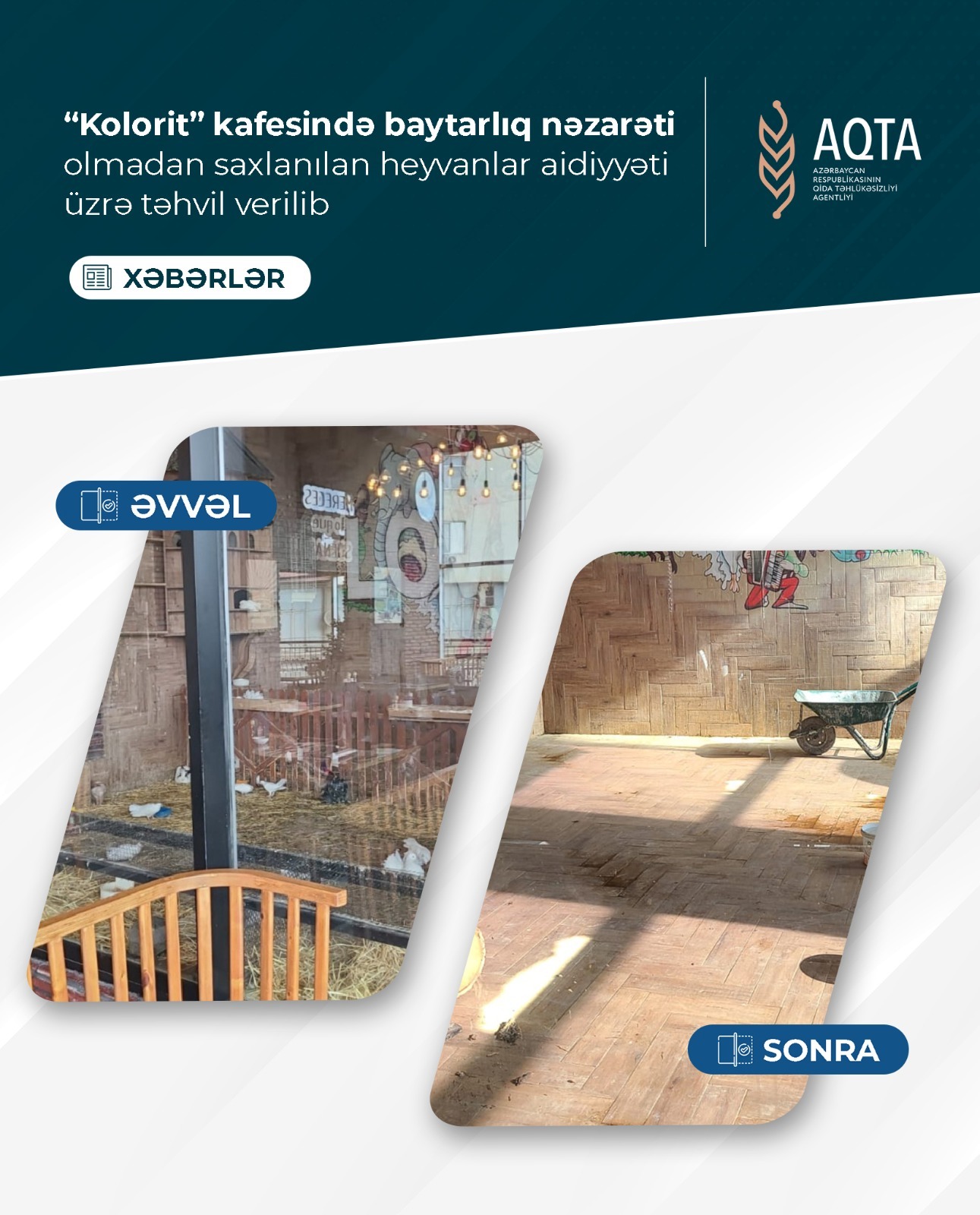 Aparılan monitorinqlər zamanı Bakı şəhəri, Xətai rayonu, M.Hadi küçəsi, ev 2094 ünvanında fəaliyyət göstərən, fiziki şəxs Ələkbərzadə Fərid Fərhad oğluna məxsus “Kolorit” kafesində müəyyən edilmiş baytarlıq nəzarəti olmadan saxlanılan heyvan və quşlar (5 baş göyərçin, 15 baş dovşan, 2 baş xoruz, 4 baş tısbağa) aidiyyəti üzrə təhvil verilib və digər zəruri tədbirlər görülür.