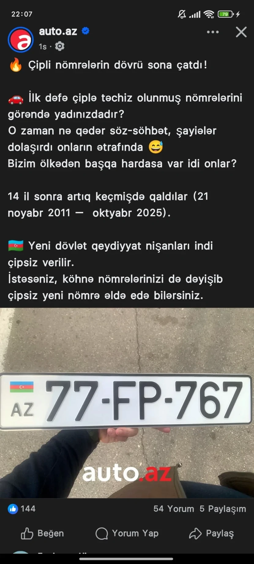 Avtomobillər üçün dövlət qeydiyyat nişanları artıq çipsiz verilməyə başlanıb.
