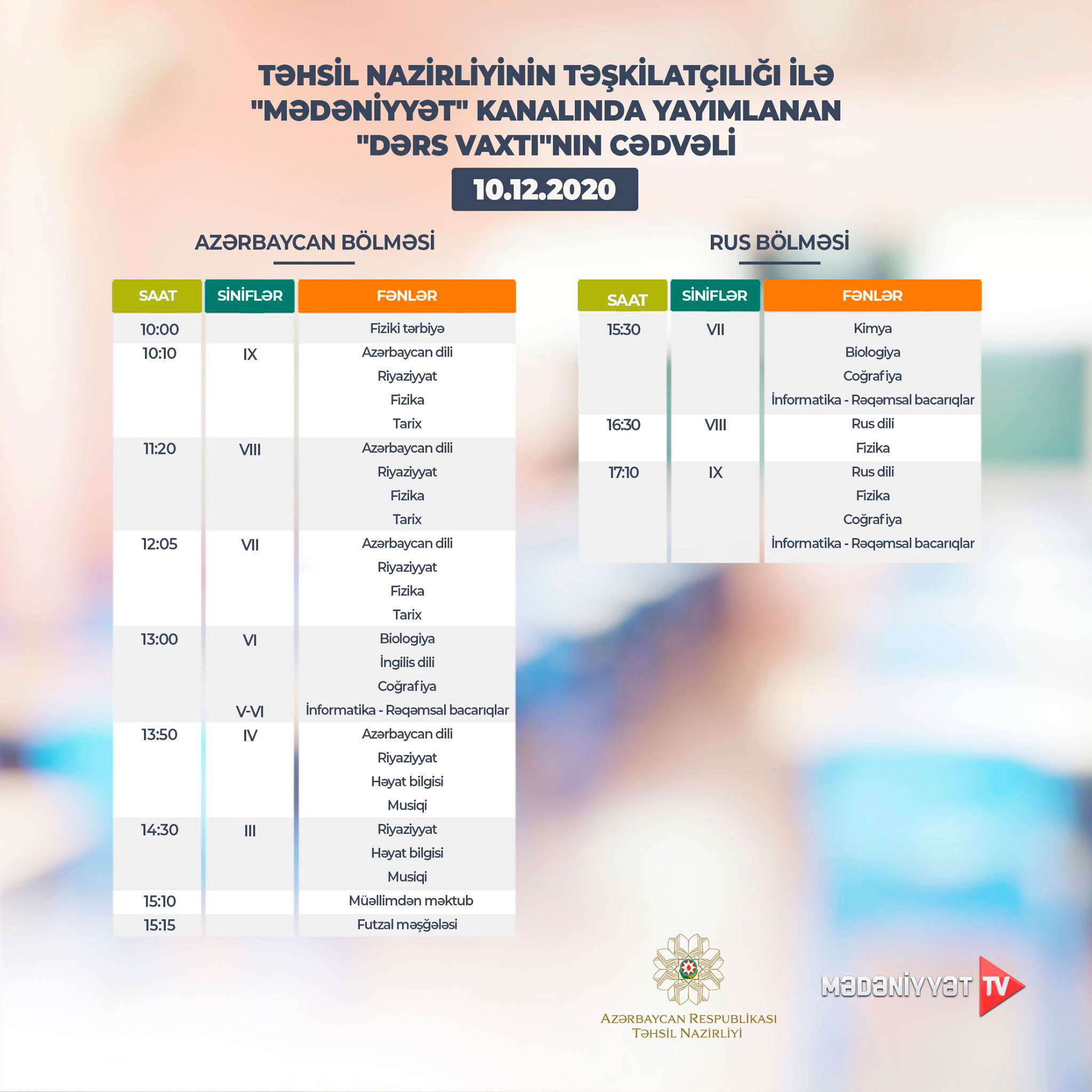 "Mədəniyyət" və "ARB Günəş" telekanallarında yayımlanan “Dərs vaxtı” proqramının bu günə olan cədvəli açıqlanıb.