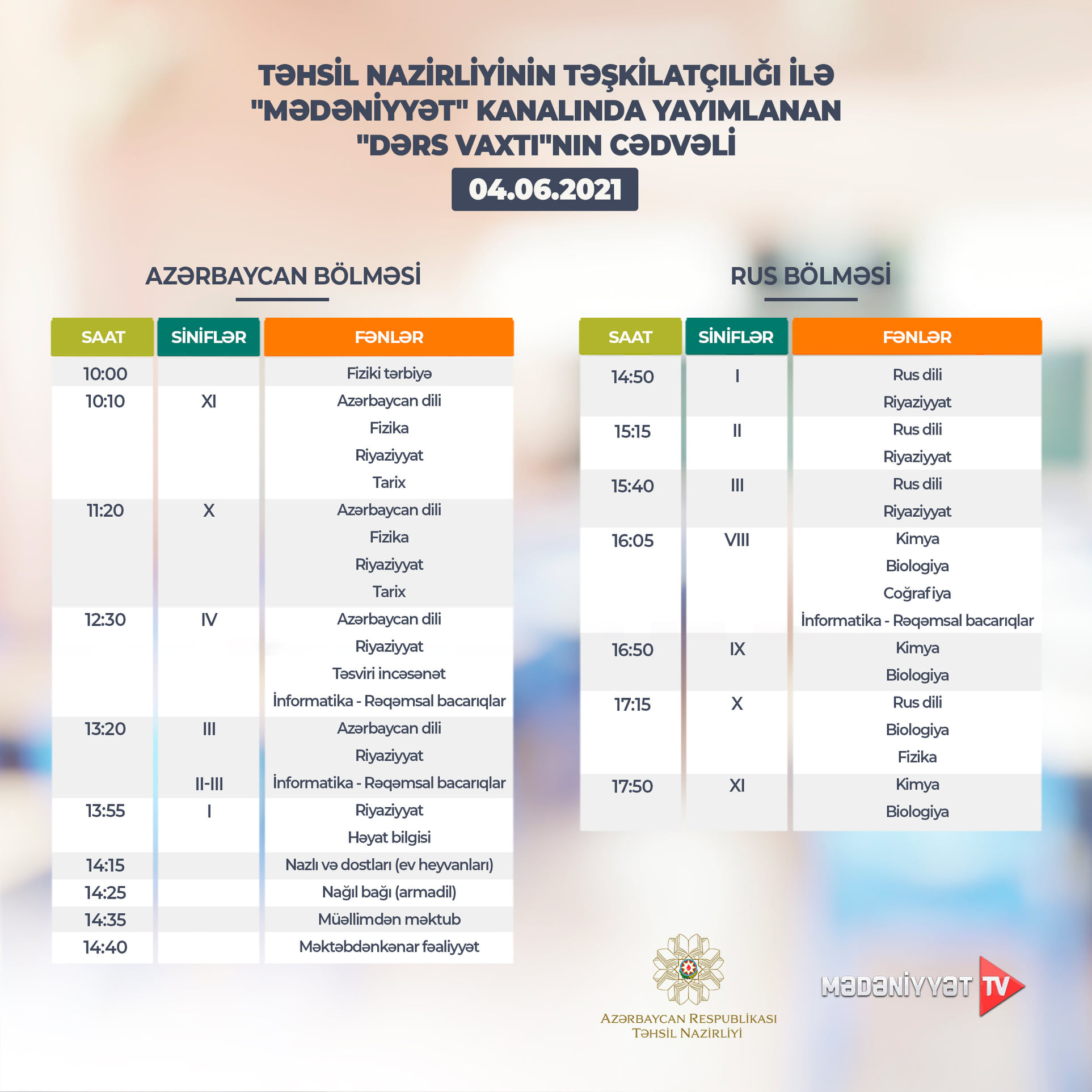 "Mədəniyyət" və "ARB Günəş" telekanallarında yayımlanan “Dərs vaxtı” proqramının bu günə olan cədvəli açıqlanıb.