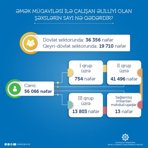 Altsistemdə hazırda mövcud olan müqavilə bildirişlərinin 56 066-sı əlilliyi olan şəxslərlə bağlanılan müqavilələrə məxsusdur. Rəsmi əmək münasibətində olan əlilliyi olan şəxslərin 754-ü birinci, 41 min 496-sı ikinci, 13 min 803-ü isə üçüncü qrup əlillərə aiddir. Həmçinin qeyd edək ki, altsistemdə olan əmək müqaviləsi bildirişlərinin 13-ü sağlamlıq imkanları məhdud 18 yaşadək uşaqlara məxsusdur.