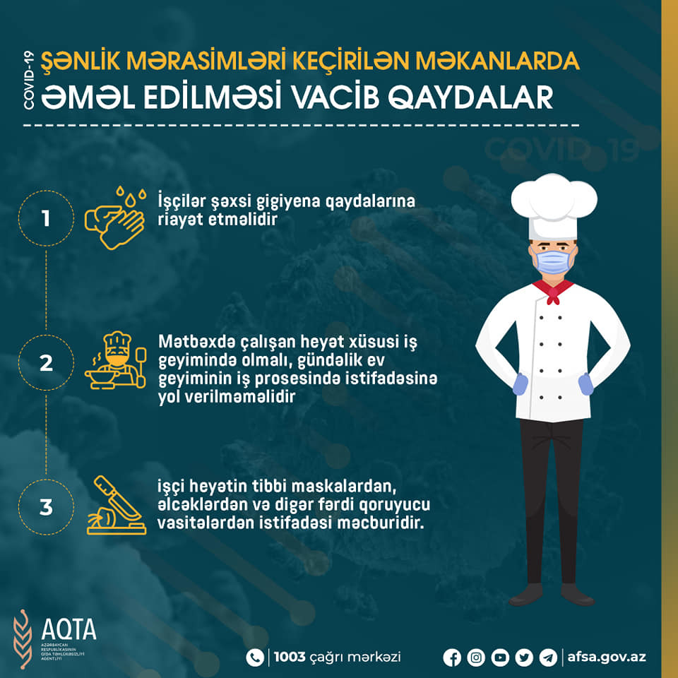 İnsanların sıx toplaşmasının xəstəliyin yayılma intensivliyinə birbaşa təsirini nəzərə alaraq, şənlik mərasimlərinin keçirildiyi ictimai iaşə müəssisələrində bir sıra qaydalara əməl olunmalıdır.