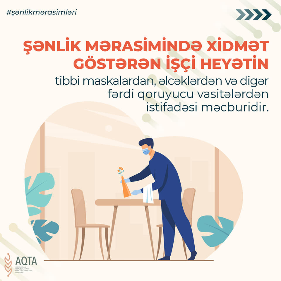 Qaydalara əsasən, şənlik mərasimlərində xidmət göstərən heyətin (musiqiçilər istisna olmaqla) tibbi maska, əlcək və digər fərdi qoruyucu vasitələrdən istifadəsi məcburidir və sahibkarlar tərəfindən bu tələbin icrasına nəzarət edilməlidir. İctimai iaşə müəssisəsində karantin rejiminin tələblərinə riayət olunması üzrə əlaqələndirici məsul şəxs təyin edilməli, obyektlərinin giriş-çıxışlarında, masalarda, kassalarda, sanitar qovşaqlarda dezinfeksiya məhlulundan istifadə imkanı, o cümlədən dezinfeksiya məhlulundan istifadə üçün müvafiq qurğular (dispenserlər) yerləşdirilməli və həmin qurğular işlək vəziyyətdə olmalıdır. Qida qəbulu zallarında, otaqlarda, habelə açıq hava sahələrində oturacaqların ara məsafəsinin eyni masa arxasında 1 metrdən, masalararası məsafələr isə 2 metrdən az olmamalıdır. Bununla yanaşı, koronavirus (COVID-19) pandemiyası dövründə restoranlar üçün adambaşına 100 nəfərə qədər 5.08 m², 100 nəfərdən sonrakı hər adam üçün əlavə 4.4 m² tələbinin yerinə yetirilməsi zəruri şərtlərdəndir. Şənlik mərasimi keçirilən məkanın və ya müəssisənin sahibi həmin obyekt daxilində fəaliyyət göstərən tədbir zalları, onların tutumu və çalışan işçi heyət (müvəqqəti işə cəlb edilmiş işçilər daxil olmaqla) barədə, habelə şənlik mərasiminin keçirilməsi tarixinə ən azı 5 (beş) gün qalmış mərasimin keçirilmə tarixi, başlama və bitmə vaxtı (saat 00:00-dan gec olmamaqla), qonaq sayı haqqında məlumatları “icaze.e-gov.az” portalına daxil etməlidir. Portala daxil edilmiş bu məlumatlara dair çıxarış monitorinqə gələn agentliyin müfəttişlərinə təqdim edilməlidir.