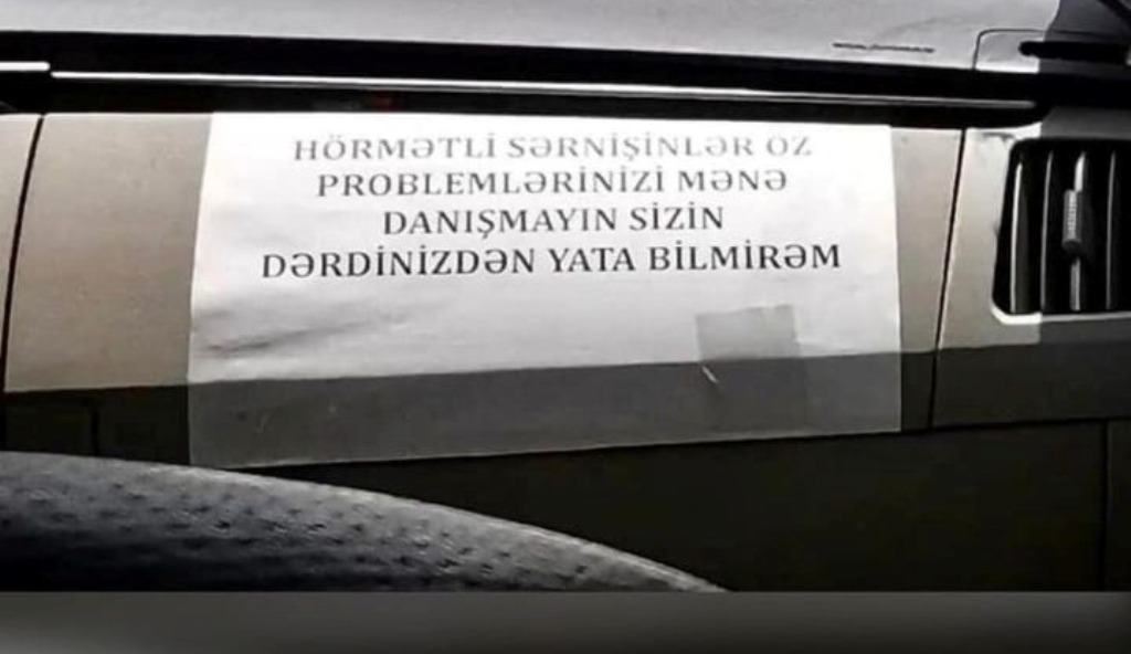 "Hörmətli sərinişinlər, öz problemlərinizi mənə danışmayın. Sizin dərdinizdən yata bilmirəm" - yazılı kağızı qabaq oturacağın qarşısına yapışdırıb.