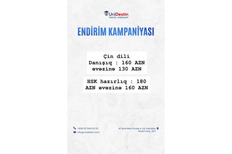 UniDestin Təhsil Mərkəzi yeni ilin gəlişi münasibətilə ingilis dili və çin dili kursları üzrə xüsusi bayram endirimlərinə start verdiyini elan edir.