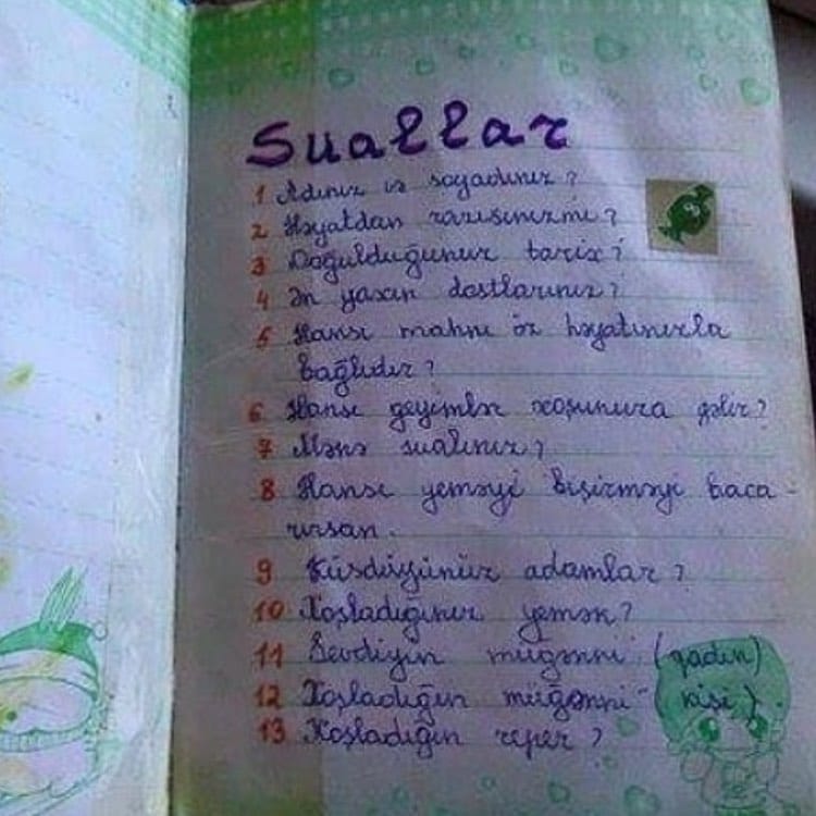 “Xatirə dəftərləri” var idi. Beş qızdan birində olurdu. Hərə bir gün götürürdü, yazırdı, ötürürdü başqa qızlara. Elə bil sirrlərini yazılı yolla bir-birlərinə verirdilər. Suallar indiki dövr üçün absurd, o vaxt üçün maraqlı idi: